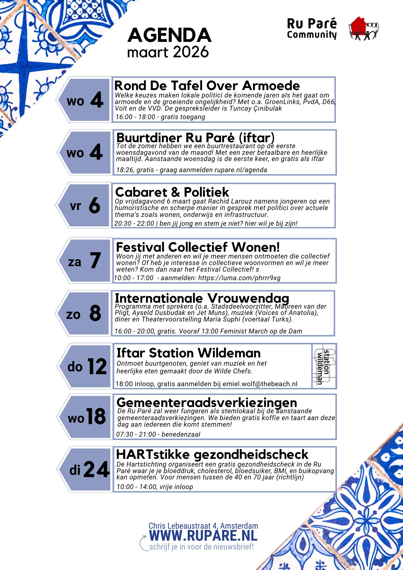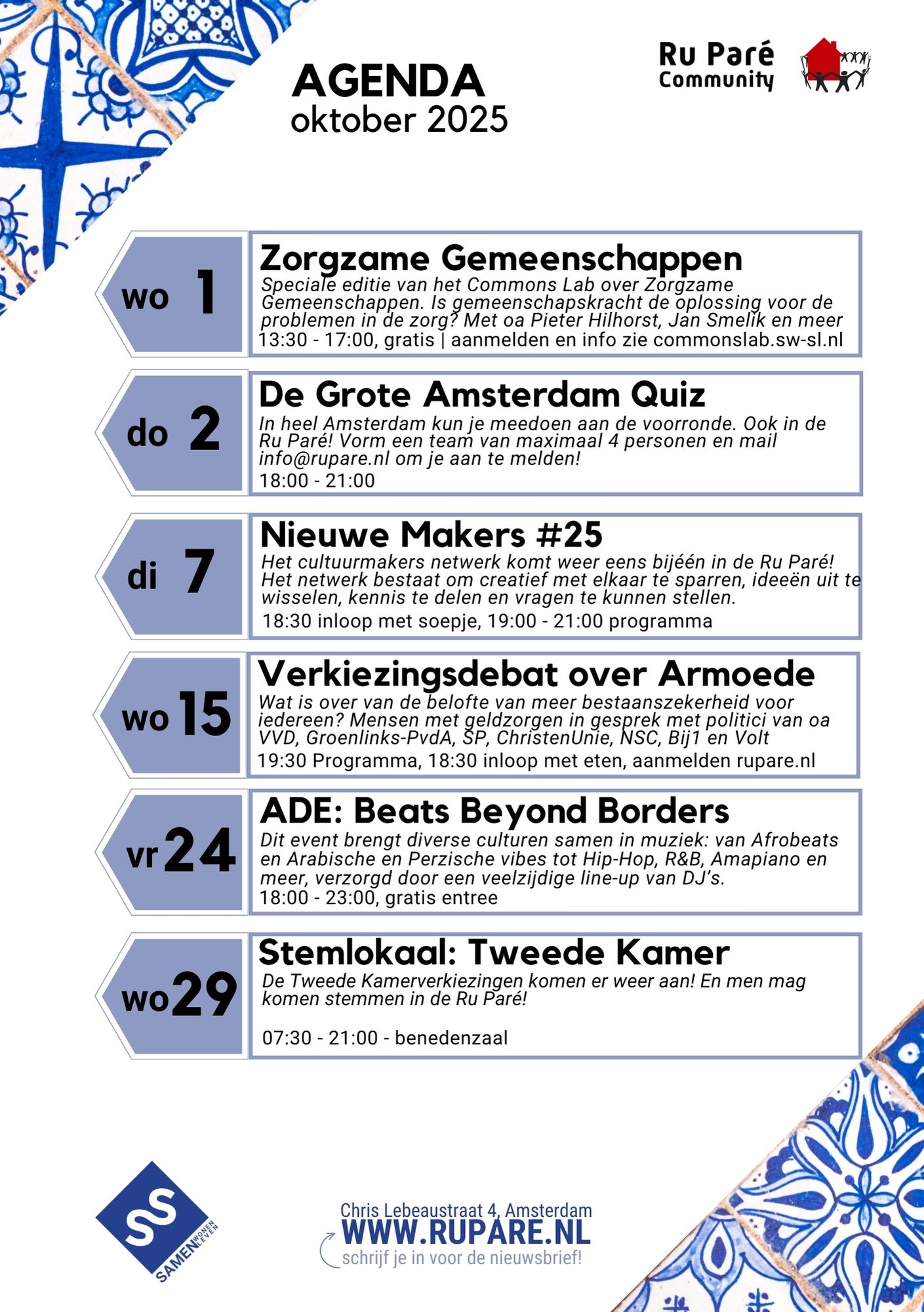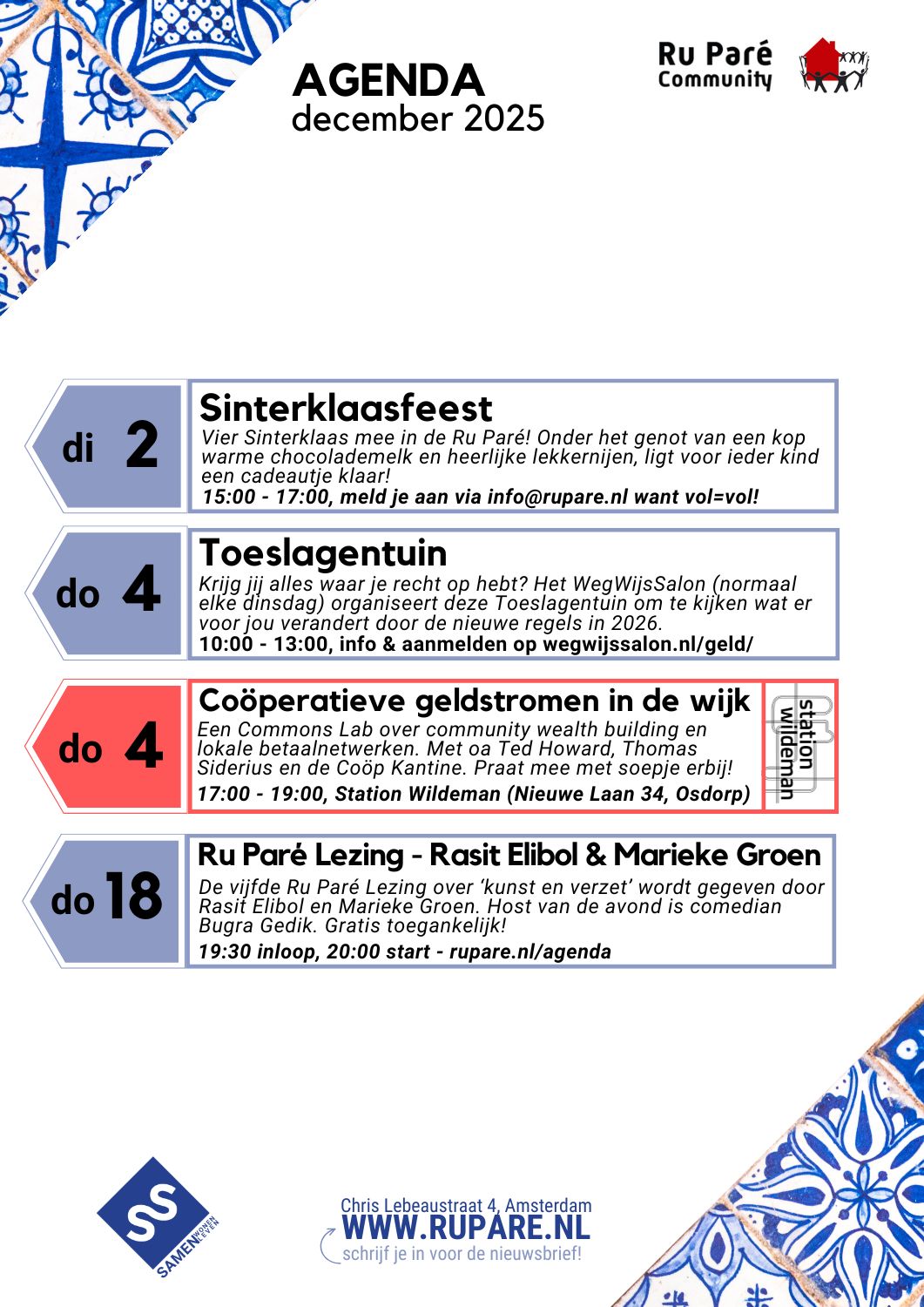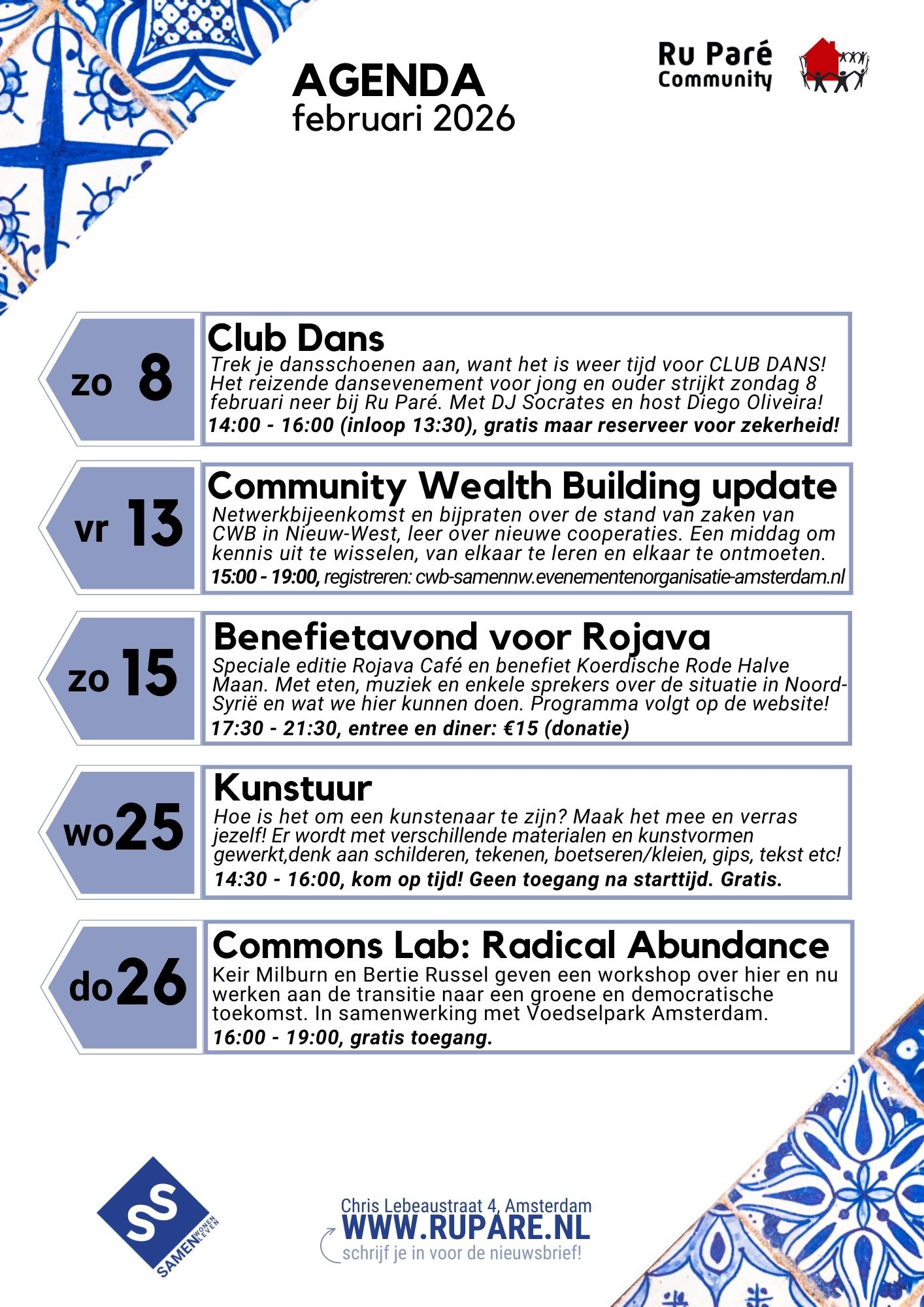 Bekijk hier alle evenementen of klik hier voor de reguliere wekelijkse activiteiten met o.a. De Buurtzaak programmering.