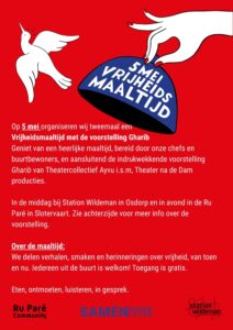 Kom op 5 mei samen genieten van de indrukwekkende voorstelling Gharib van Theatercollectief Ayvu i.s.m, Theater na de Dam producties, en aansluitend een heerlijke maaltijd, bereid door onze chefs en buurtbewoners. Eerder op de dag in Osdorp bij Station Wildeman en vanaf 18:00 in de Ru Paré!