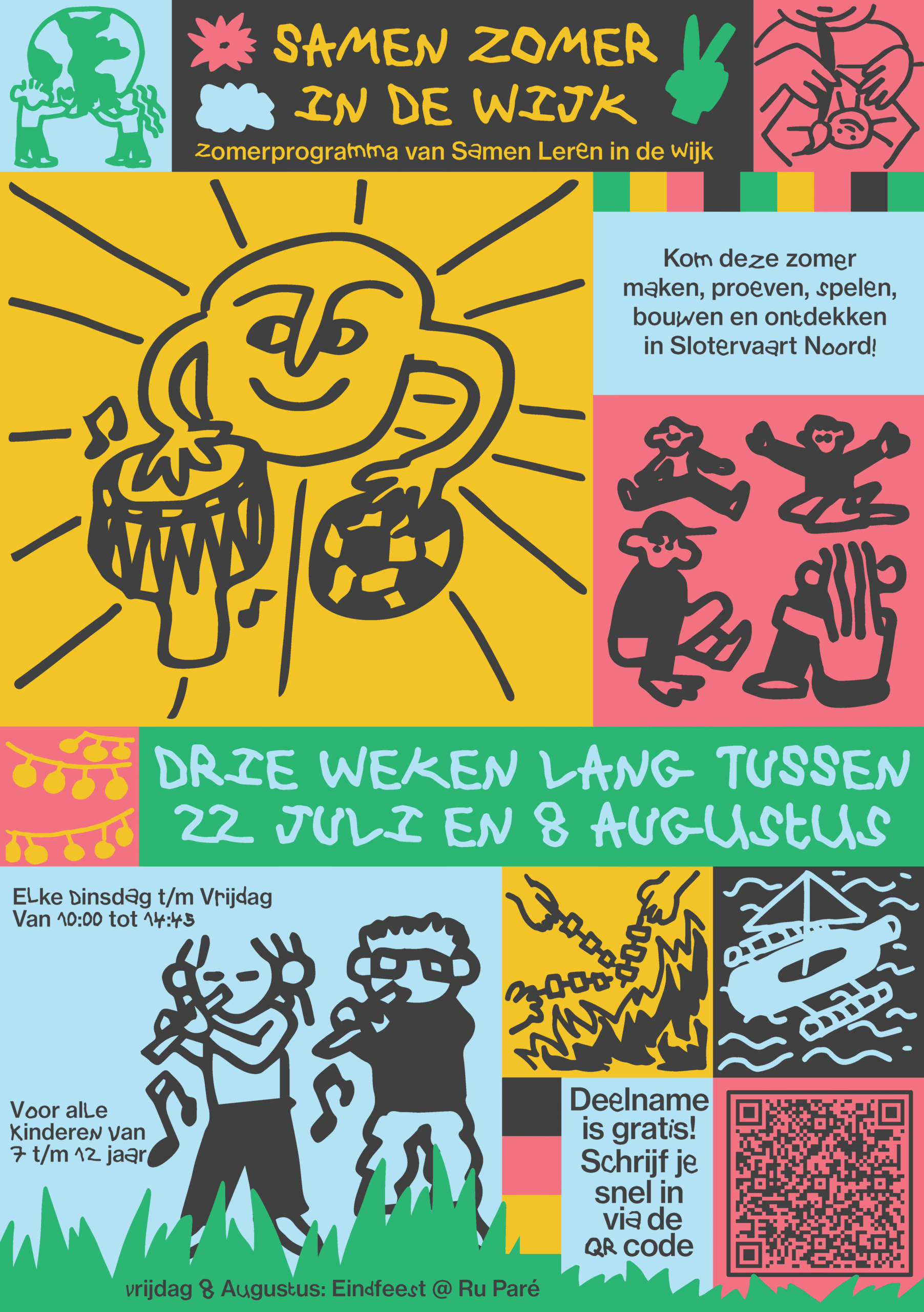 Ben jij tussen de 7 en 12 jaar oud dan kun je je vanaf 9 juli inschrijven voor 1, 2 of zelfs 3 weken! Samen Zomer in de Wijk vindt plaats van dinsdag tot en met vrijdag. Het begint om 10:00 ’s ochtends en om 14:45 kun je weer worden opgehaald. Het programma is helemaal gratis. Zie onderaan de pagina het programma. Om je in te schrijven kun je de QR code scannen of klik hier.